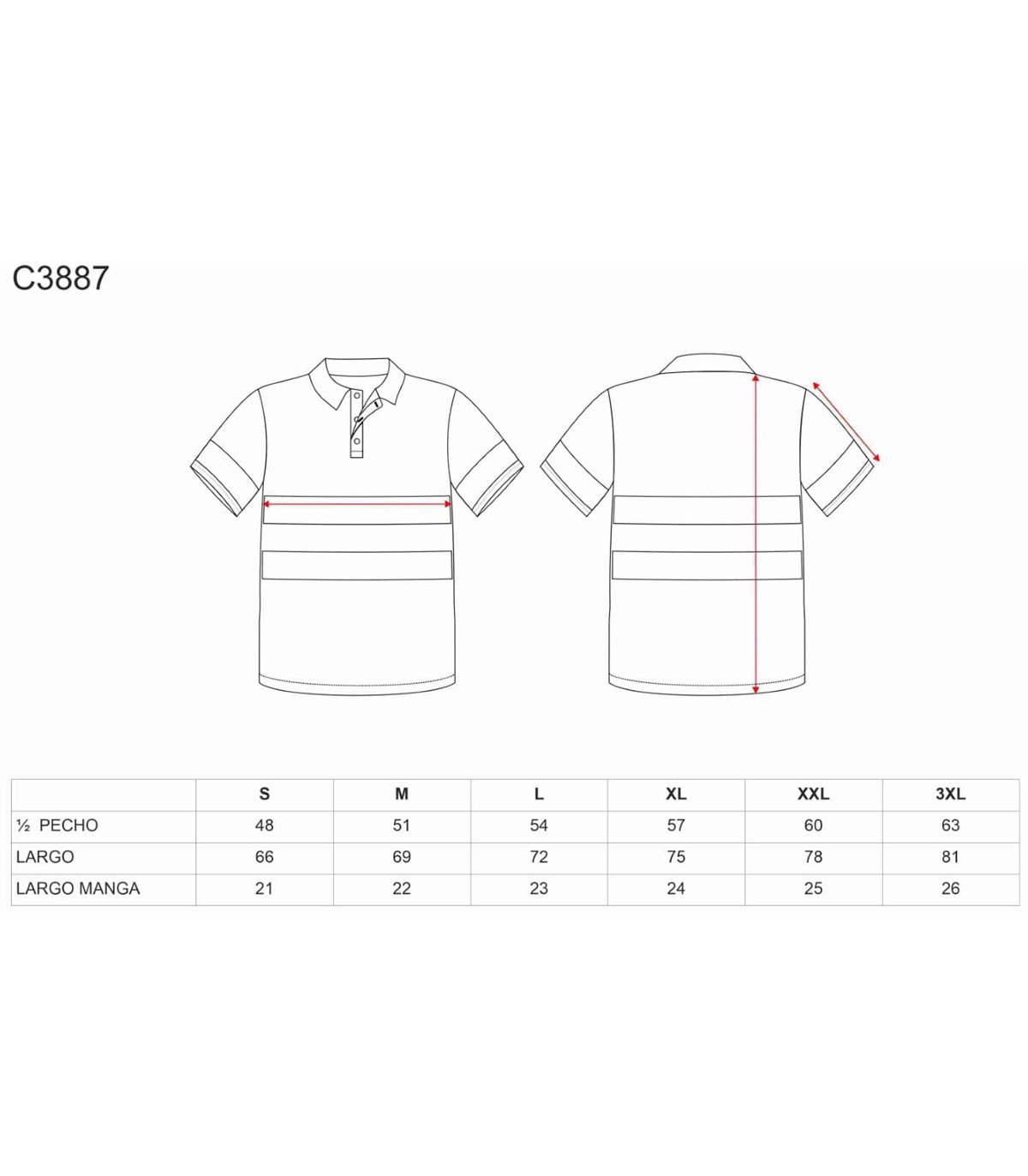 Polo con cuello clásico con tapeta de tres botones y cubrecosturas interior. Dos cintas reflectantes en pecho, espalda y mangas. Puño elástico.